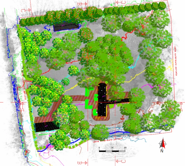 Grâce à un relevé réalisé par scanner et/ou drone, nous vous proposons d'acquérir une parfaite connaissance de votre propriété foncière: surface totale et surface occupée par les différents aménagements (pelouse, cheminement etc.), et les variations altimétriques (courbes de niveaux).